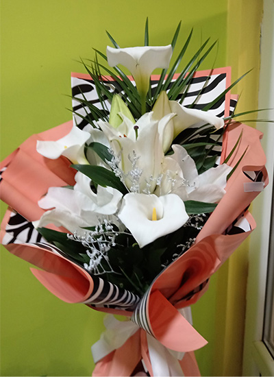 Buket sačinjen od pet belih kala i tri bela ljiljana donosi sofisticiran i smiren izraz, prikladan za svečane i važne trenutke. Beli cvetovi simbolizuju poštovanje, čistoću i dostojanstvo, dok pažljivo izabrano zelenilo i dekorativni detalji naglašavaju strukturu i stil samog aranžmana.