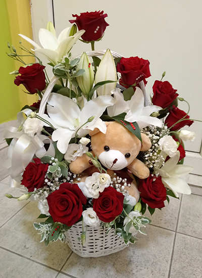 Elegantan i bogat aranžman u pletenoj beloj korpi sa crvenim ružama i belim ljiljanima izražava duboka osećanja, zahvalnost i nežnost. Plišan medo u središtu kompozicije donosi dozu topline i razigranosti, čineći ovaj poklon idealnim za romantične trenutke, izvinjenja ili iznenađenja od srca.
