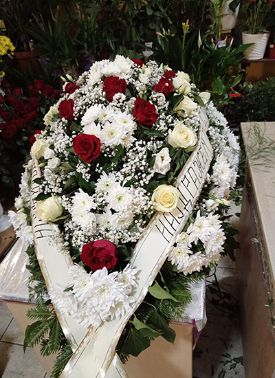 Ovaj pogrebni venac klasičnog elipsastog oblika izrađen je od svežeg cveća u pažljivo biranim tonovima – crvene ruže simbolizuju večnu ljubav i poštovanje, bele hrizanteme čistotu i mir, dok krem ruže unose toplinu i zahvalnost. Dekoracija gipsofilom i zelenilom doprinosi punoći i mekoći aranžmana, a traka sa posvetom daje ličnu notu.