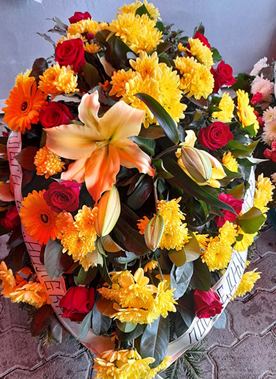 Ovaj raskošan pogrebni venac kombinuje tople nijanse žute i narandžaste sa dubokom crvenom, simbolizujući poštovanje, zahvalnost i snagu života. U središtu dominira veliki ljiljan u nijansi kajsije, okružen žutim hrizantemama, gerberama i crvenim ružama. Traka sa posvetom i dekorativna bela mašna dodaju završni, lični pečat.